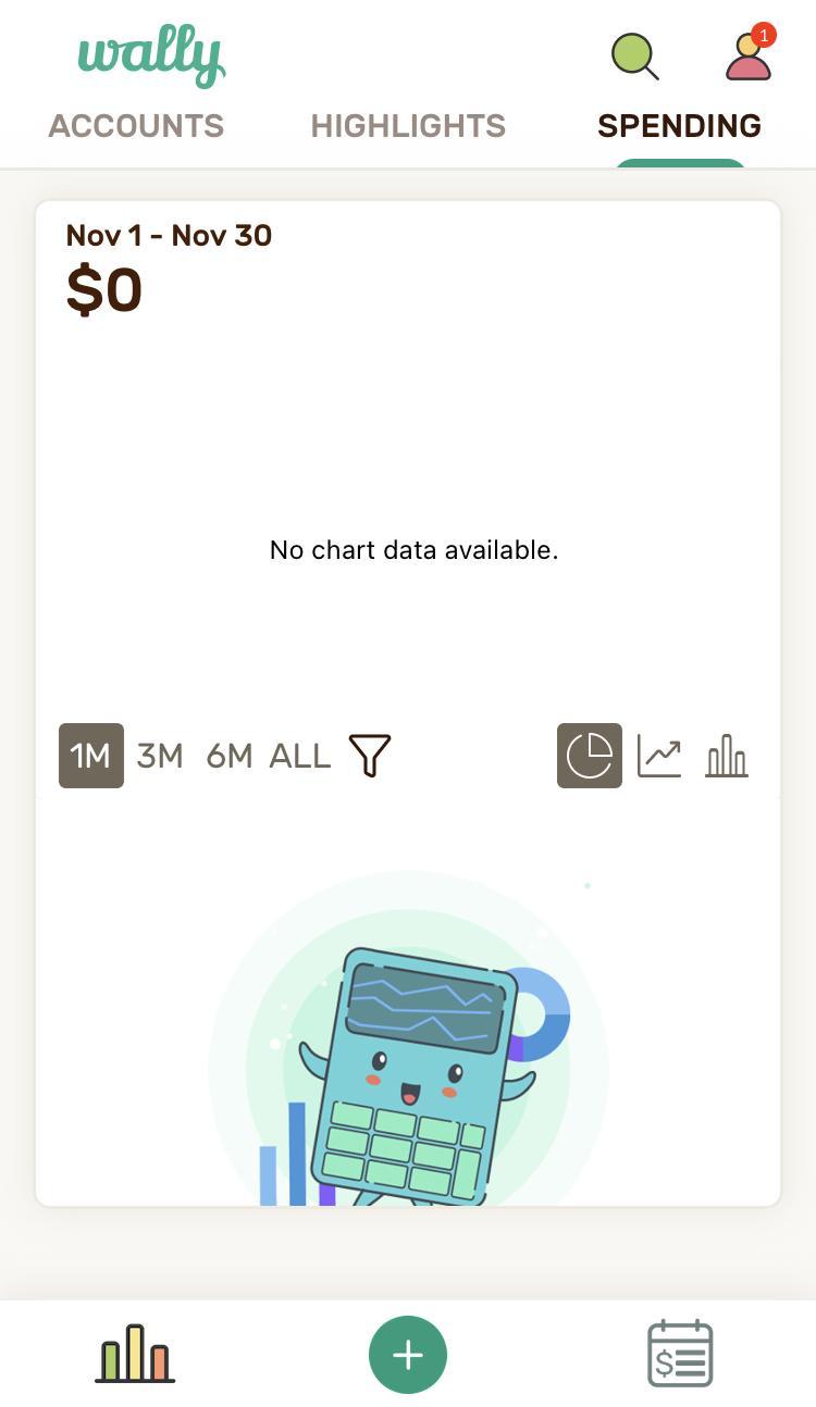 Wally will regularly open up to the Highlights tab. This will show you a total – the amount you have left to spend for this budget. It will show you a graphic up to three months back (if you have not paid for the upgrade) and up to 7 days of recent transactions. As you scroll down, you will also see the amount of money you have available in your recently used accounts.