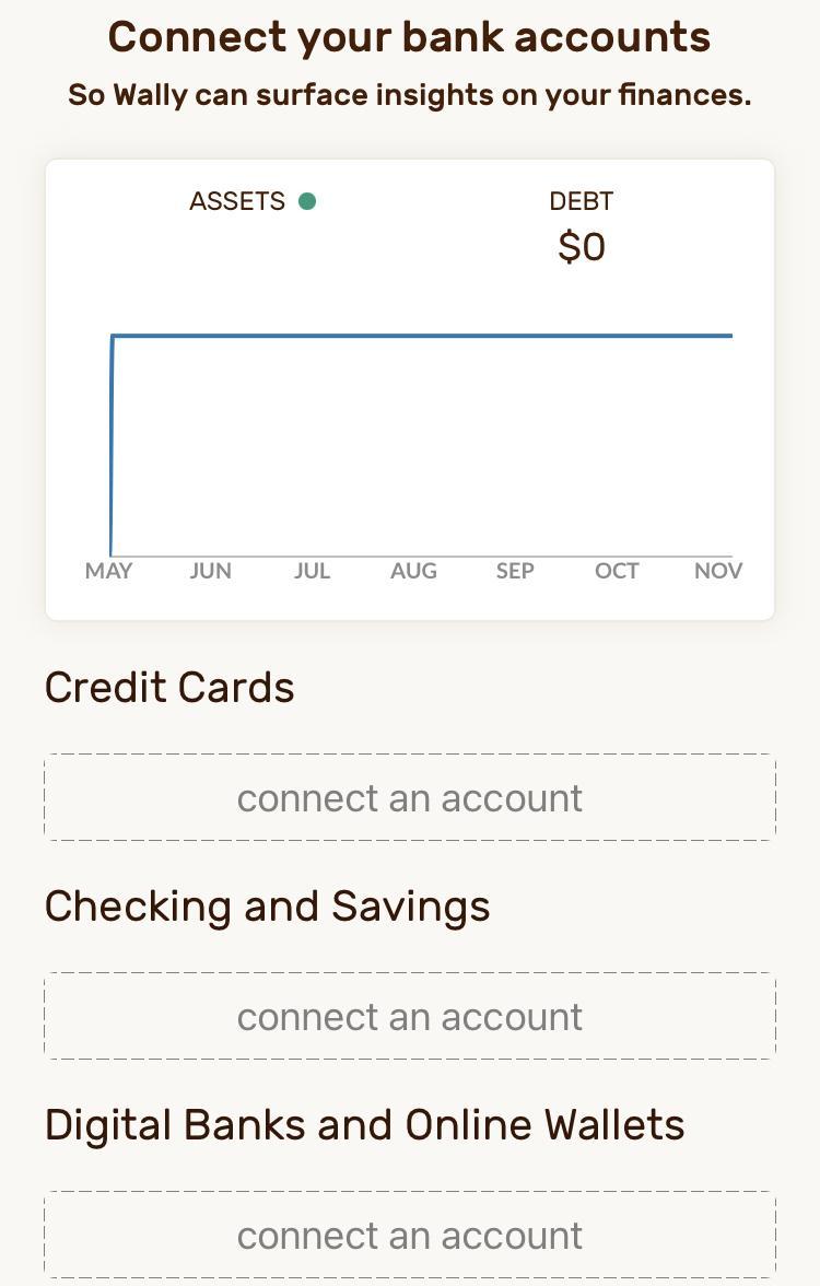 Once you have selected the goals you wish to work on with Wally, you will be asked to connect your accounts. You can connect several different options, including credit cards, checking and savings, digital banks, online wallets, loans, foreign accounts, and cash. Syncing the accounts is secure, and Wally uses Plaid to maintain its security.