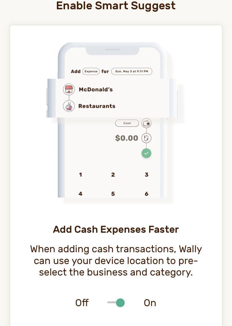 You can easily switch notification options on or off. One example is the ability of Wally to track your location for cash transactions.