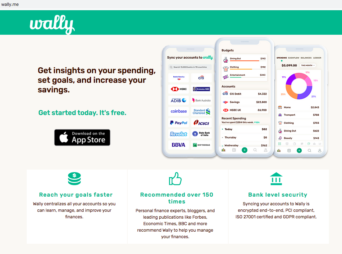 Although Wally doesn’t have a presence on a website, they do have a homepage that gives an overview of the app and how it can help you to manage your money.